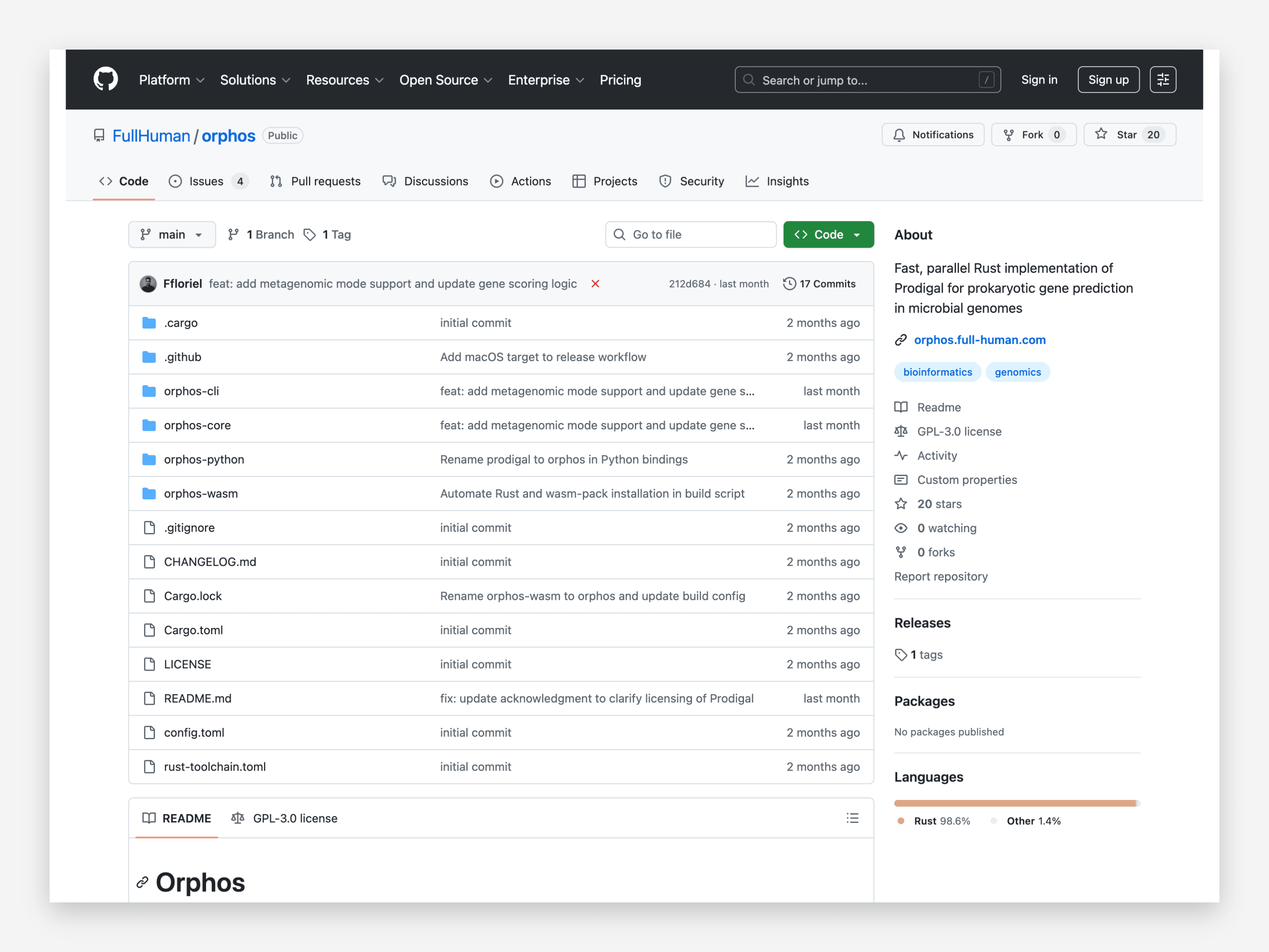 Orphos is a modern Rust-based implementation of a prokaryotic gene finding algorithm that identifies protein-coding genes in microbial genomes. It applies an unsupervised machine-learning dynamic programming approach to genome annotation and supports both single genomes and metagenomic data.